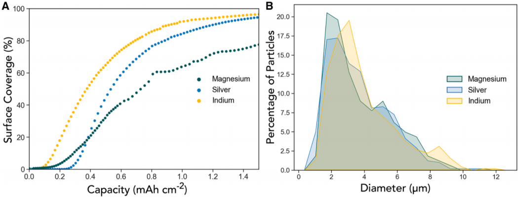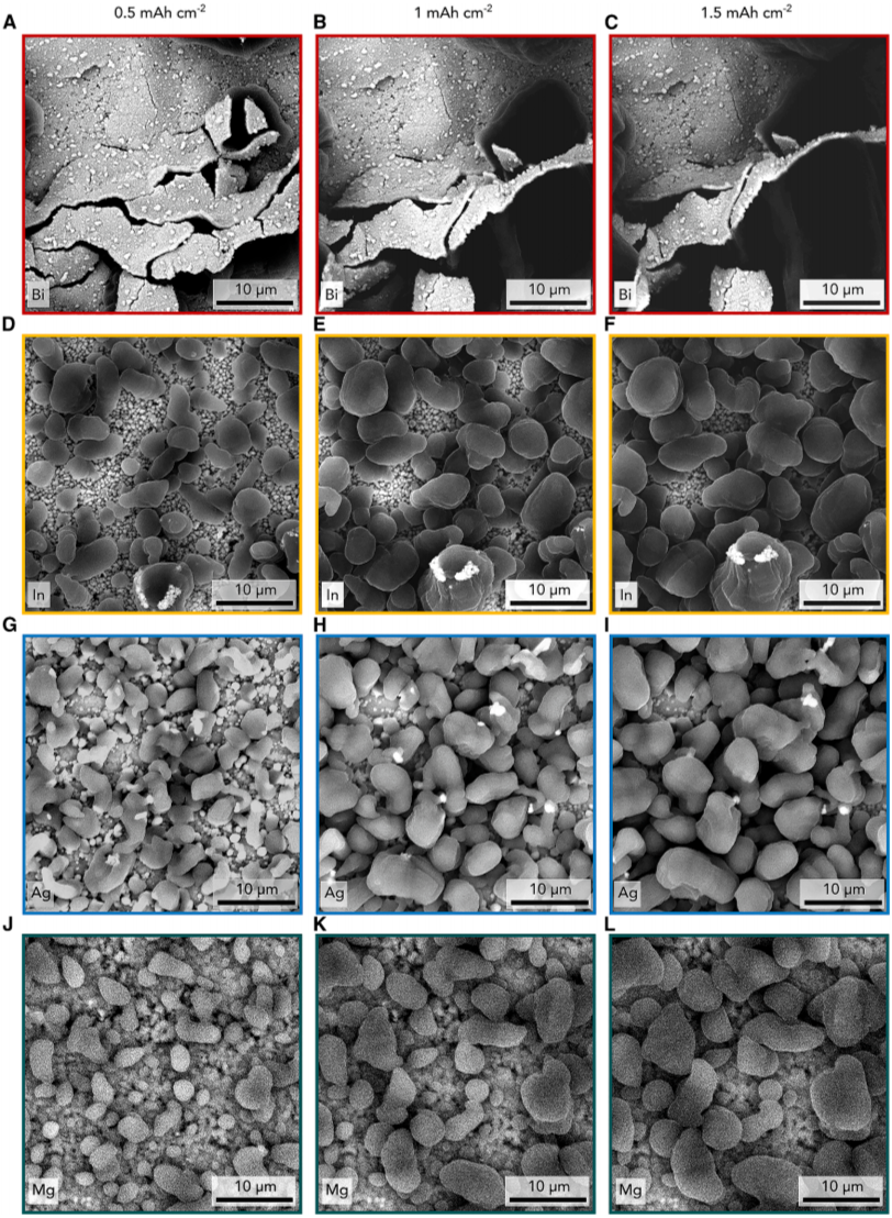 继续在SEM中对铋、铟、银和镁夹层进行原位成像,观察表面锂金属沉积形貌。图4快照图像显示,铋夹层上沉积形貌是从夹层下方生长出厚锂柱,柱体扩展会抬起并断裂铋夹层,夹层上方表面未观察到锂成核。初始锂化后,铋夹层对促进表面均匀锂镀层作用不大。铟、银和镁夹层沉积形貌相似,锂在整个表面均匀成核并球形生长,这可能是合金降低了界面处锂成核的过电位。镀层继续时,现有球体增大,初始成核期后很少有新成核发生。