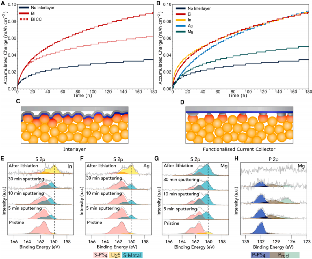 最后通过库仑滴定时间分析(CTTA)和原位X射线光电子能谱(XPS)研究夹层对固体电解质界面(SEI)形成和生长的影响。CTTA结果显示,夹层直接沉积在固体电解质上时,锂消耗量高于沉积在集流体上,且均高于无夹层的电池,说明增强的电子接触面积促进了更多的SEI形成。XPS分析表明,金属夹层与固体电解质反应形成各自的金属硫化物,铟和银夹层在锂镀层时形成硫化锂,镁夹层因反应动力学慢,SEI形成速率低。镁夹层可能通过形成钝化的SEI减少锂消耗,这种SEI保留在界面处,而其他夹层形成的SEI在锂沉积时立即被置换。研究表明,均匀锂沉积对可逆循环很重要,但电子导电夹层可能增加固体电解质降解,影响电池能量效率。使用自钝化层或反应形成钝化SEI的夹层,如镁,可在“无锂”配置中抑制锂SEI生长,同时保持电极间增强接触。