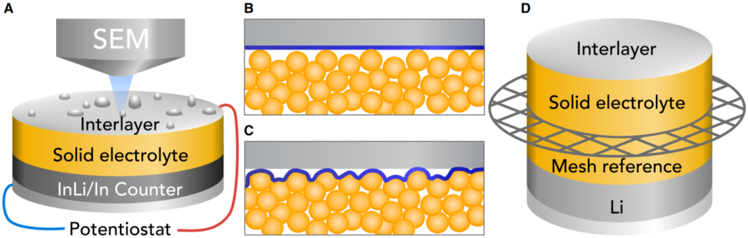 英国牛津大学Mauro Pasta教授等人,使用原位扫描电子显微镜系统研究了铋、铟、银和镁夹层的锂化动力学。形成固溶体的夹层能促进均匀沉积并保持结构完整性,而形成金属间化合物的夹层会因体积变化发生机械故障,导致异质锂化。进一步的三电极阻抗谱和库仑滴定时间分析表明,夹层沉积到固体电解质上可增加与集流体的电化学活性接触,降低有效电流密度,但会增加固体电解质界面的生长。总体而言,沉积形貌、机械稳定性和循环效率受合金形核行为和锂扩散率支配。相关研究成果以“Impact of metallic interlayers at the lithium - Li6PS5Cl solid electrolyte interface”为题发表在Joule上。