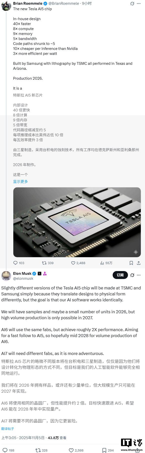 IT之家11月5日消息,特斯拉CEO埃隆・马斯克(Elon Musk)今日在X上回应网友关于“Tesla AI5芯片”的讨论时,首次披露了该系列芯片的生产计划与后续路线图。