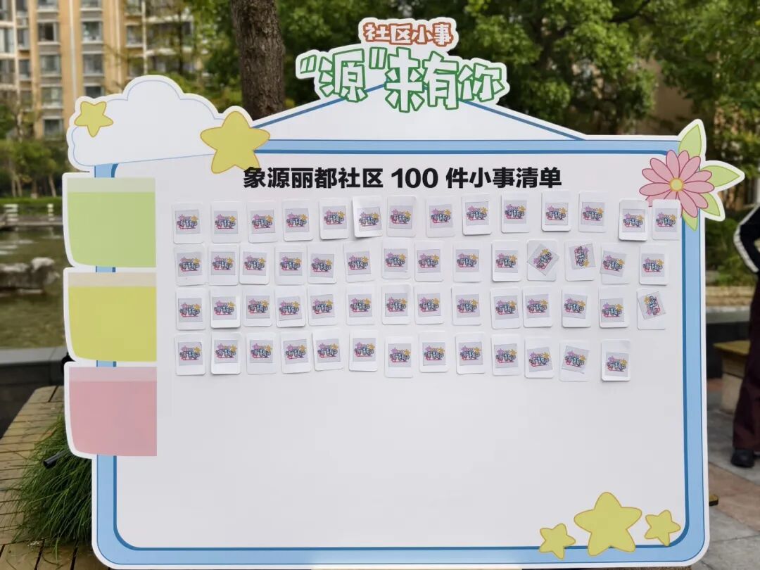 基层治理的难点在于“散”,痛点在于“慢”,关键在于“准”。活动前期,象源丽都以“楼组文化”为纽带,以“小事治理”为切入点,通过楼组群广泛收集居民的意见。楼道照明升级、非机动车规范停放、公共报箱维护、邻里互助帮扶、文化活动开展等这些看似琐碎却与日常生活息息相关的“关键小事”,都被一一记录、梳理,形成了《100件小事清单》。每一条清单都源于居民的真实需求,每一个条目都承载着大家对美好家园的期望,这既为楼组文化建设找到了“民生落脚点”,也为社区治理明确了“发力方向”。