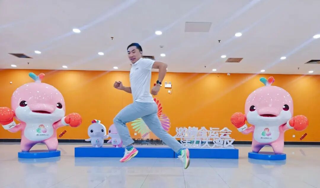 速春雨在宝安体育中心十五运打卡点前展示跑姿