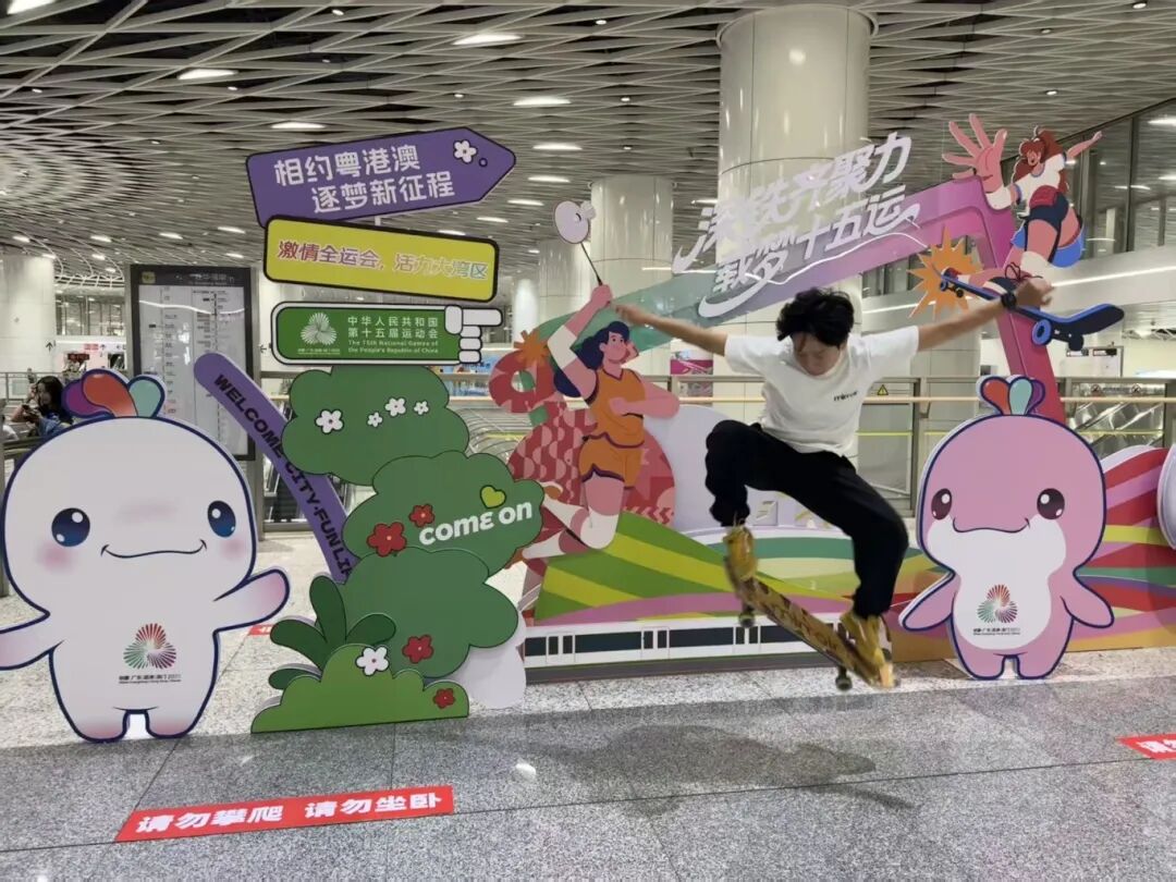 六六在岗厦北地铁站十五运打卡点前展示滑板动作