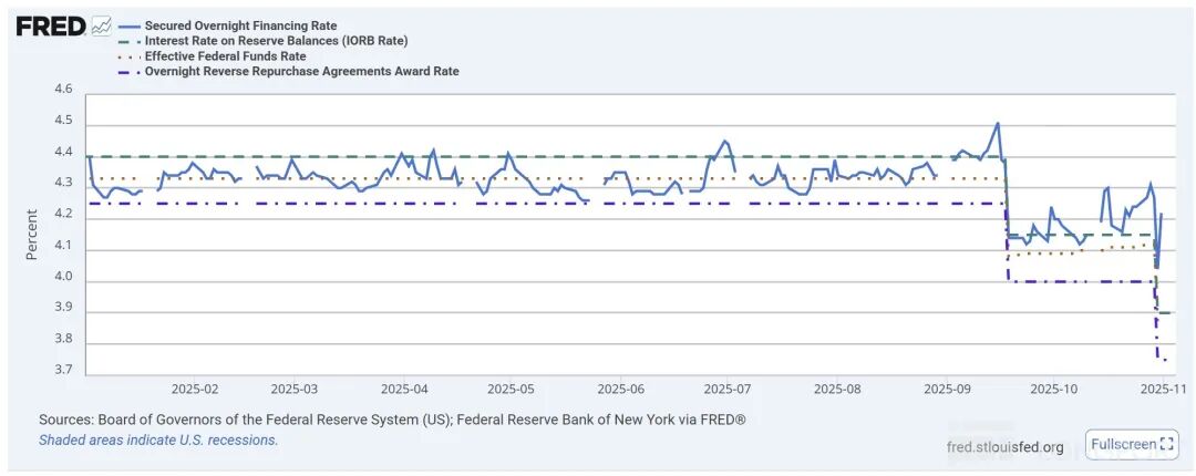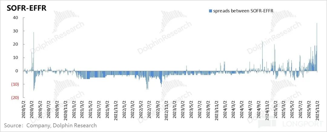 通常在市场资金充裕时,SOFR可能贴着ON RRP交易;而资金严重紧缺时,可能会大幅超出IORB。