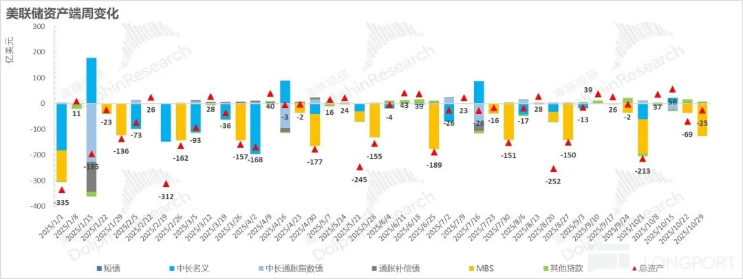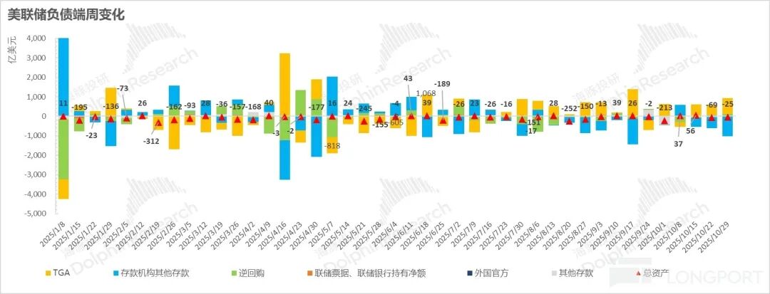 但10月政府关门后,财政部仍按原计划持续进行财政融资发债。需要注意的是,10月开始TGA进一步升高,主要是通过挤压银行存款准备金,而非原本银行体系的剩余流动性——逆回购余额。