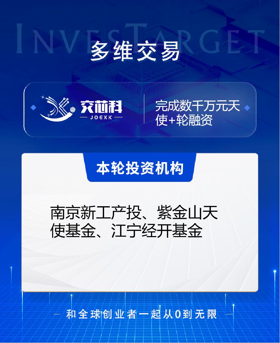 近日,南京新工产投、紫金山天使基金、江宁经开基金联合完成了对交芯科(上海)智能科技有限公司的数千万元天使+轮融资,多维资本担任本轮融资独家财务顾问。