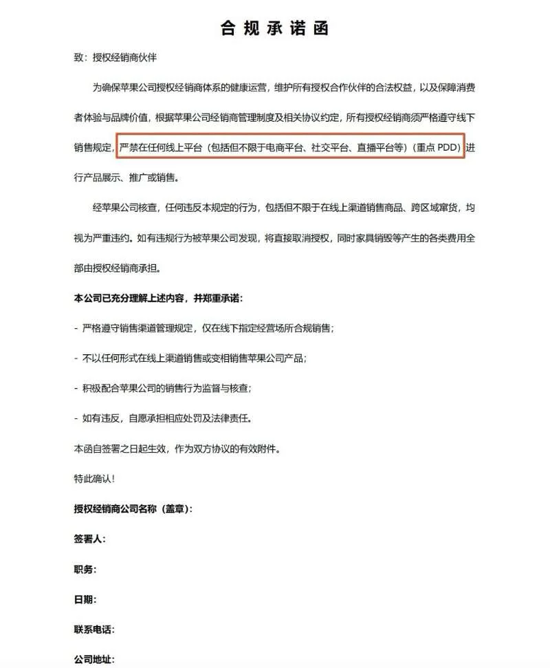 多家媒体证实,苹果中国区已向线下授权经销商发布“禁令”,禁止他们与任何电商平台合作,严禁在电商、社交、直播等线上平台展示、推广或销售苹果产品,“小时达”“一件达”等即时零售服务也在禁令范围内。