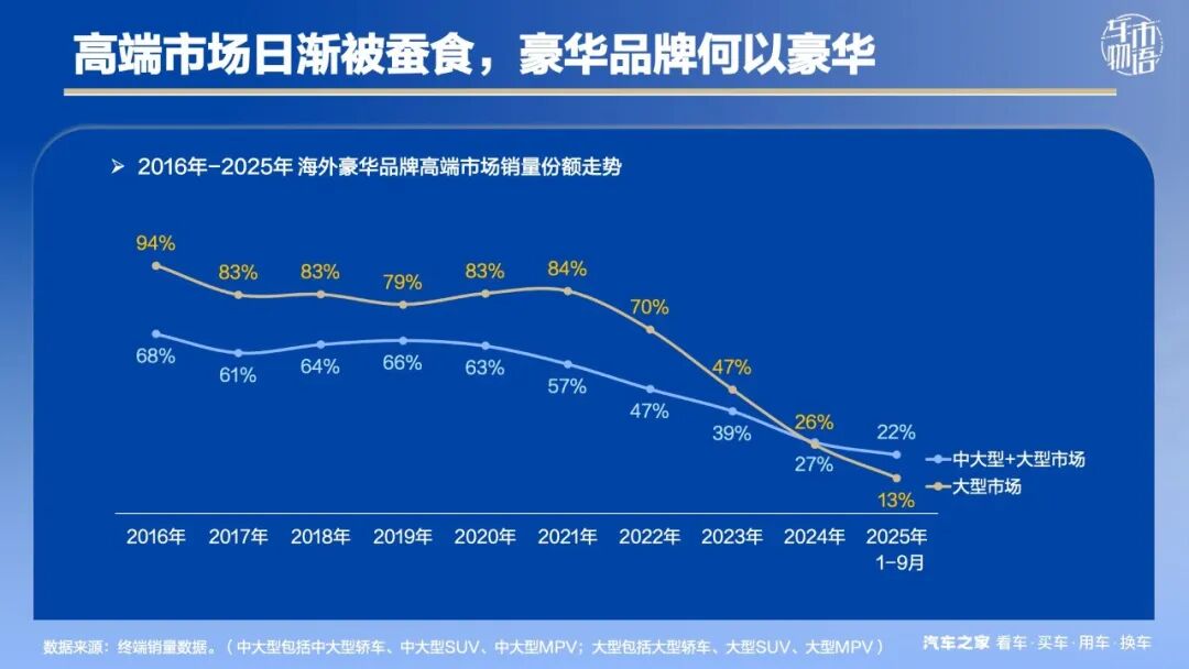 终端销量数据显示,海外豪华品牌阵营在大型级别市场的市占率,从2016年的94%绝对王者,降至13%。综合看中大和大型级别市场,2016年还能保持68%的份额,2021年开始快速下降,到2025年1 - 9月仅剩22%。