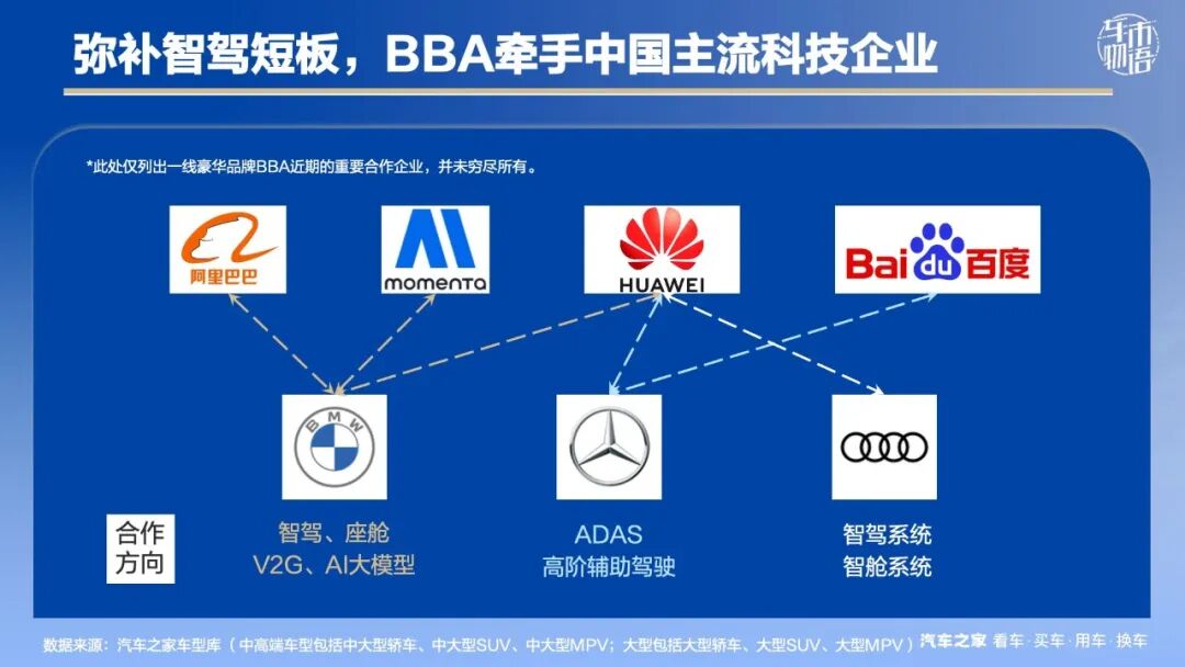 以BBA为例,智能化领域的深度合作大多在2025年才开始。奔驰与Momenta加强高阶智驾合作,2025年推出四款新车型;宝马与阿里巴巴2025年3月启动通义大模型智能座舱合作,计划2026年上车;奥迪与华为合作,搭载ADS 3.0高阶智驾系统等。