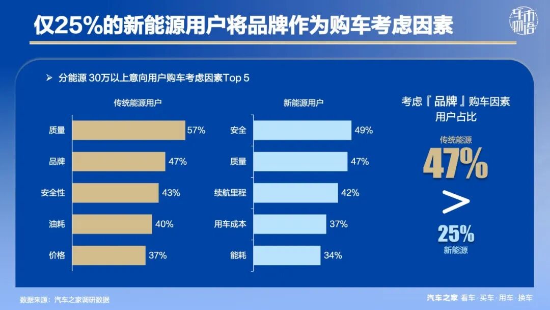 与传统能源市场不同,豪华品牌的品牌效应在新能源市场难以发挥,即便面对30万以上高预算用户也是如此,这主要是因为购车需求不同。在传统能源用户心中,品牌价值仅次于质量考量,占比47%,但在新能源用户心中连前五都排不进,只有25%的用户选择。