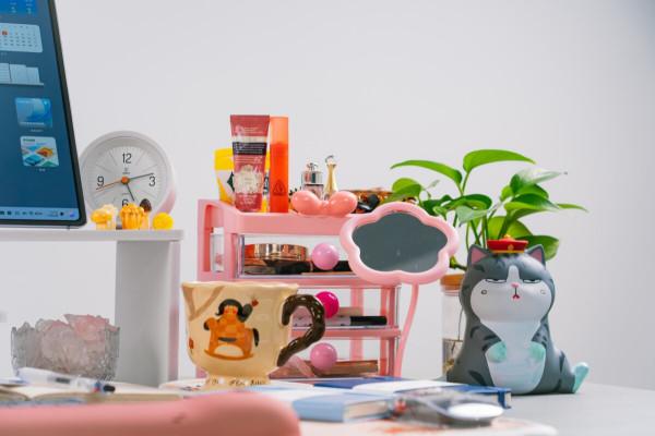 右边的粉色置物架是超成功的收纳产品。悄悄说,摆在桌面一个月,已有不下五个人问小编要链接。颜值高的粉色外壳只是表象,多层可抽拉小抽屉才实用,女孩子的口红、粉饼等零碎物品都能放进去,最上层还能放常用小物件,是办公室必备!