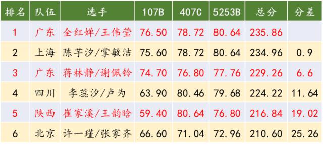 从小分表可以看出,全红婵/王伟莹仅在107B动作拿到76.50分,领先陈芋汐/掌敏洁0.9分,407C和5253B分数相同。若去掉前六组合的107B成绩,会出现更有趣的局面: