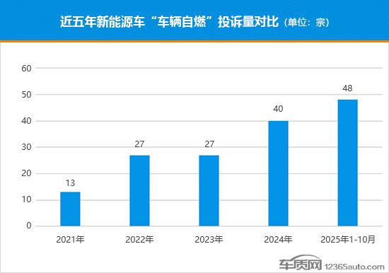 车质网数据统计,近五年累计受理新能源汽车“车辆自燃”投诉155宗。2021年投诉量为13宗,2024年达40宗,涨幅超2倍;2025年前10月,投诉量达48宗,超过2024年全年,其中不乏高端车型。