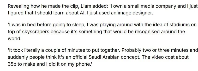 Liam Hawes对《每日邮报》说,“我有一家小型媒体公司,当时想学习人工智能,就用了一款图像设计软件。” “睡前,我在床上想到在摩天大楼顶上建体育场的想法,觉得这会在全世界被认可。” “制作这个视频只花了几分钟,大概两三分钟,突然人们就以为这是沙特阿拉伯的官方宣传。制作成本约35便士,我是用手机做的。”
