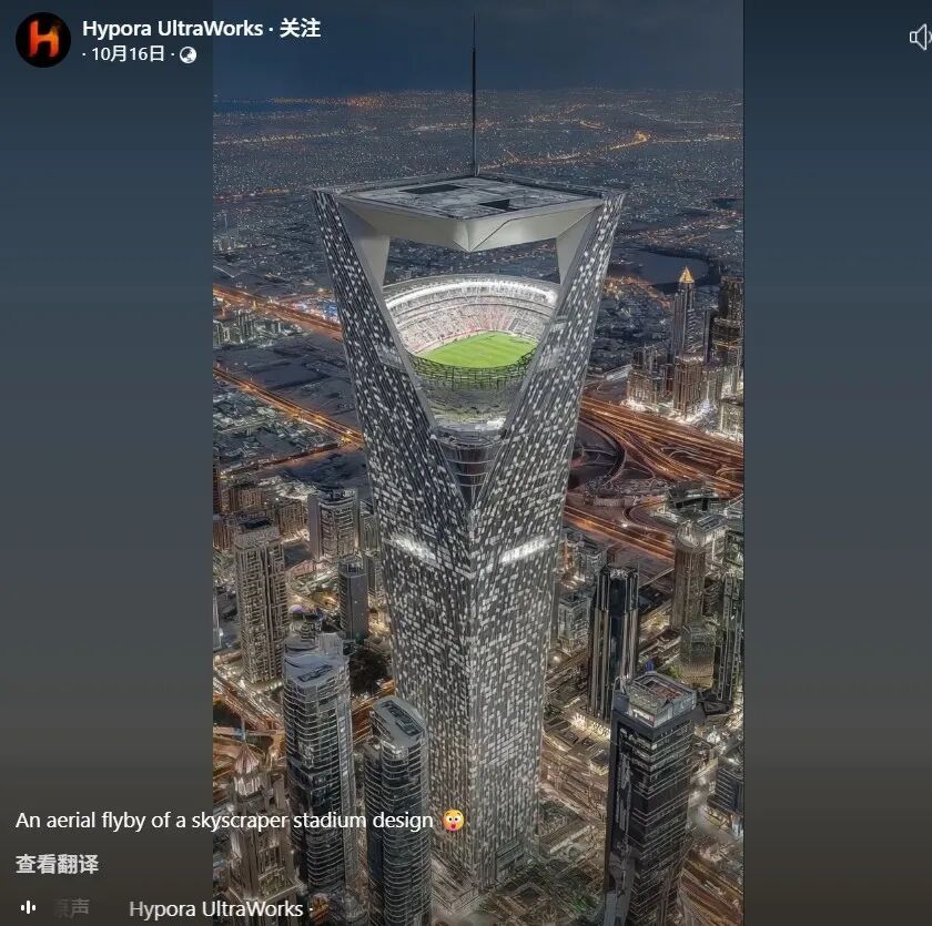 Hypora UltraWorks主页以视觉设计为主,发布过很多类似摩天大楼视频。原视频配文为“摩天大楼体育场设计的空中飞行拍摄视角”,未提及“沙特”或“世界杯”,网传说法是后续社交平台传播时的误导。