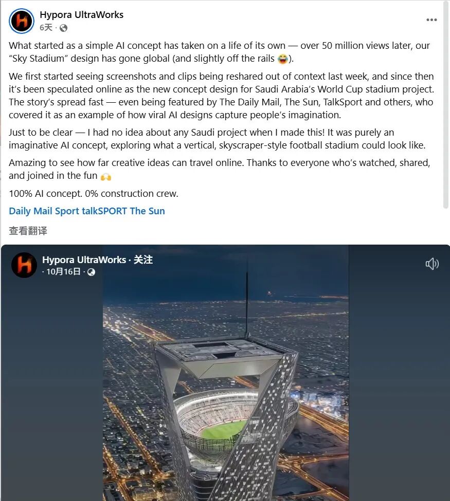 10月30日,Hypora UltraWorks转发原视频并表示,“做这个时,我完全不知道沙特阿拉伯的任何项目!这纯粹是想象的AI概念,探索垂直摩天大楼风格的足球场可以是什么样。”