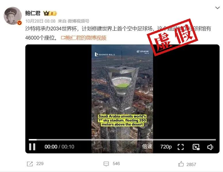 - 网传“沙特空中足球场”画面是由一个设计AI视频的账号发布的,原视频配文未提及沙特,网传说法是社交平台传播时产生的误导。
