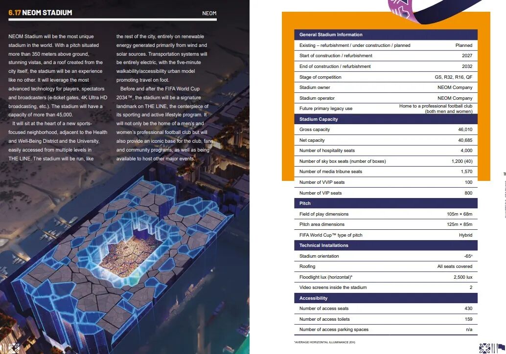 在沙特的2034年世界杯申办计划书中提到,“该球场将位于地面以上超过350米……体育场容量将超过45000人。该球场将和新未来城其余地区一样,完全依靠风能和太阳能产生的可再生能源。交通系统将全部采用电动模式,同时以步行可达的5分钟城市模型促进步行出行。”