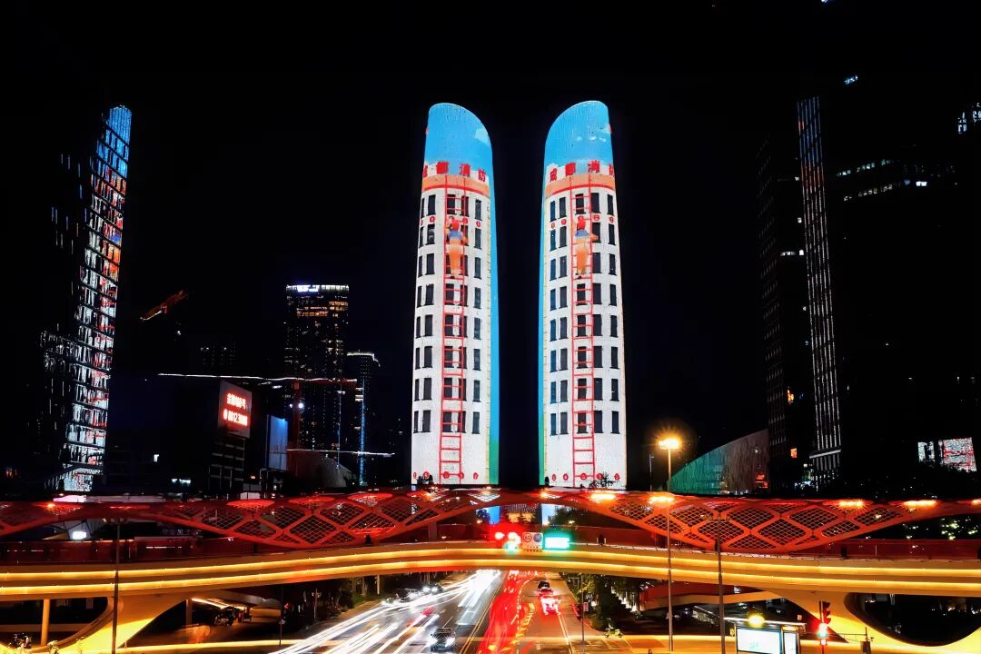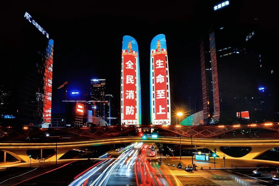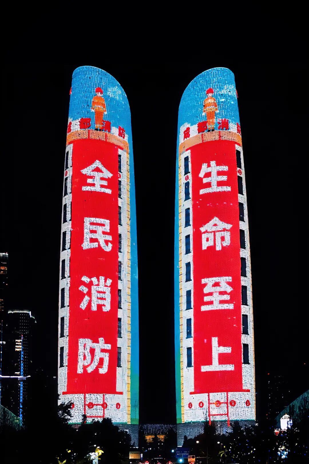 双子塔摇身一变,成了巨型“消防宣传屏”。