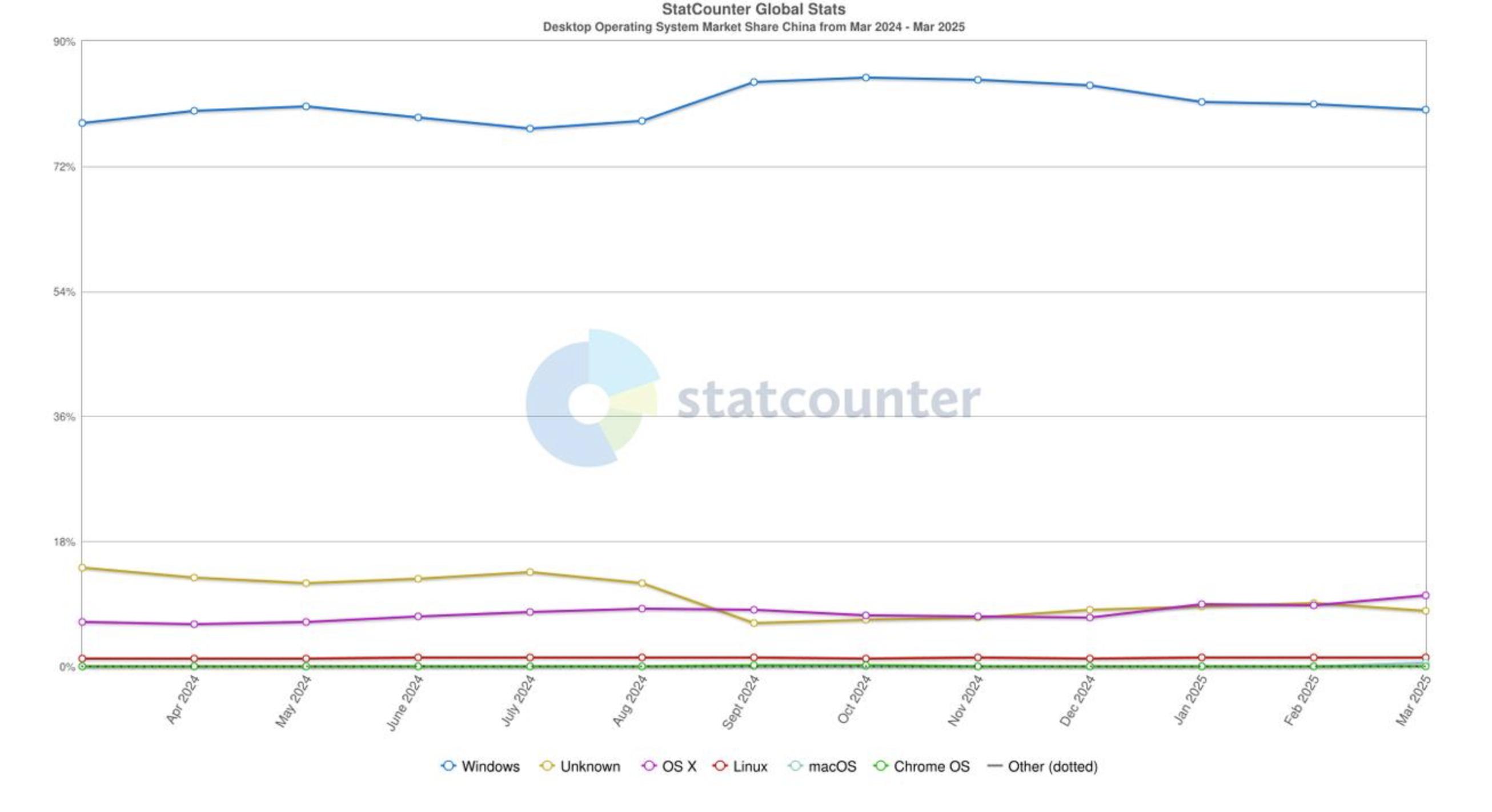 今年3月,苹果macOS在中国桌面操作系统的市场份额首次突破10%,超越疫情期间最高的9.94%,创下自2009年有统计以来的历史新高。