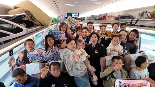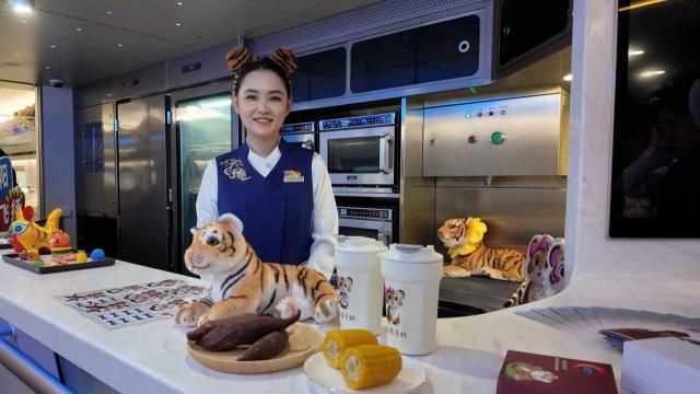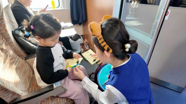 在车厢内部,特色功能区为旅客提供了丰富多样的文化互动活动。“东北虎非遗馆”邀请了剪纸艺人现场教学,旅客可以亲手制作虎形窗花;造型可爱的虎形手办、虎纹饼等泥塑也深受旅客喜爱。乘务人员佩戴着虎形徽章,在列车上讲解科普知识,并组织互动活动,让旅途氛围温馨又愉悦。