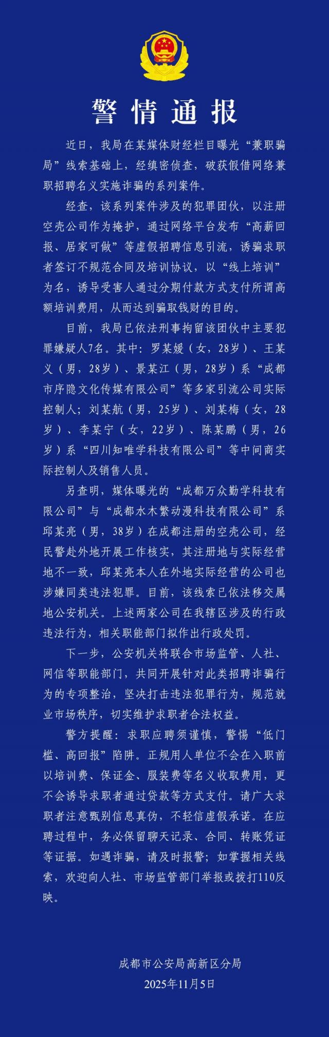 成都警方通报:破获网络兼职招聘诈骗案,7人被刑拘