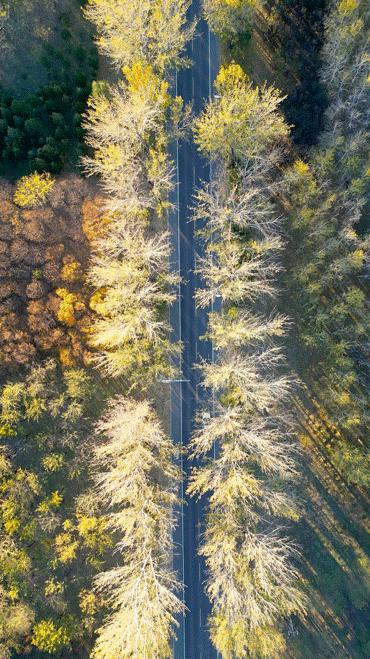 一驶入木邵路,就仿佛闯进了一个彩色的隧道。阳光透过枝叶的缝隙洒下,在路面上形成一片片斑驳的光影。随风飘落的树叶在车轮旁打转,像是在热烈欢迎每一位路过的旅人。远处,舞彩浅山与路旁的彩林相互映衬,每转过一个弯,都能看到一幅全新的秋日画卷。