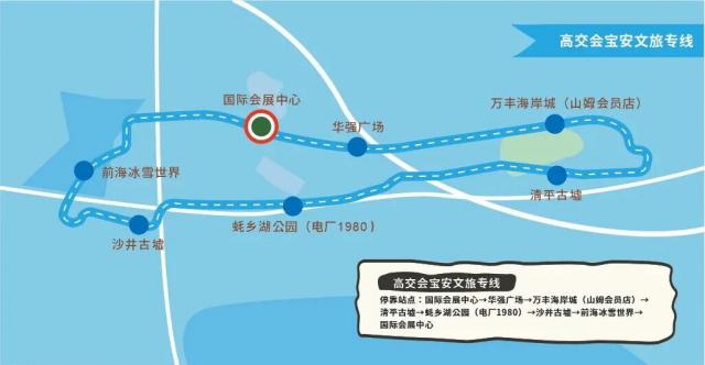 国际会展中心→华强广场→万丰海岸城(山姆会员店)→清平古墟→蚝乡湖公园(电厂 1980)→沙井古墟→前海冰雪世界→国际会展中心