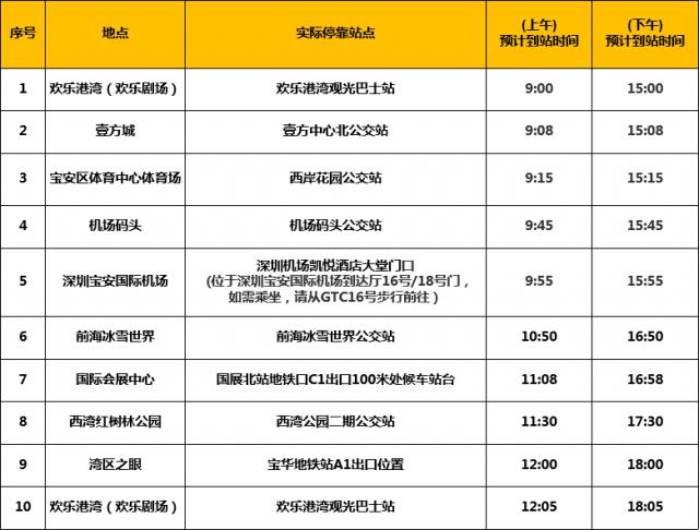 欢乐港湾(欢乐剧场)→壹方城→宝安区体育中心体育场→机场码头→深圳宝安国际机场→前海冰雪世界→国际会展中心→西湾红树林公园→湾区之眼→欢乐港湾(欢乐剧场)