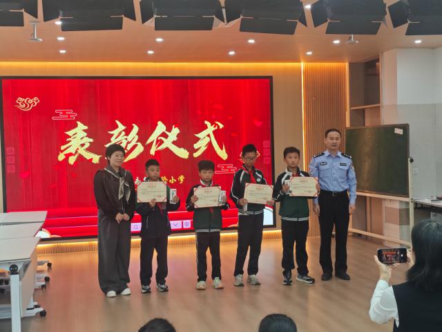 在同学们和老师的掌声中,四位拾金不昧的同学来到讲台前,从警察叔叔手中接过了专属于他们的奖状。
