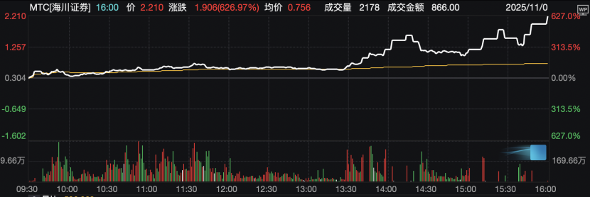 海川证券大幅上涨,收盘涨超620%。公司官网资料显示,海川证券(NASDAQ:MTC)是2015年6月创立、2019年1月在纳斯达克上市的资产管理集团,海川证券面向全球,以投资银行、资产管理等业务为核心,在美国及香港持有证券经纪、资产管理和投资银行牌照,海川接受美国SEC、FINRA及香港金融管理局等多地监管机构的监管。
