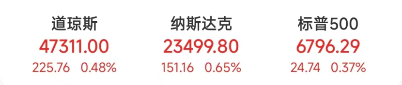 当地时间周三(11月5日),美股三大指数集体收涨。道指涨225.76点,涨幅为0.48%,报47311.00点;纳指涨151.16点,涨幅为0.65%,报23499.80点;标普500指数涨24.74点,涨幅为0.37%,报6796.29点。
