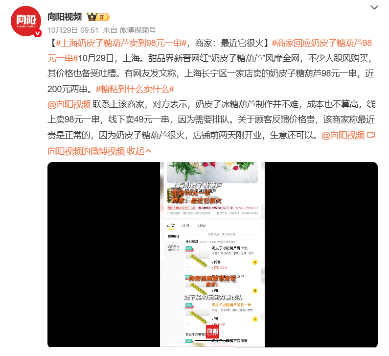市面上多数奶皮子糖葫芦价格在15元到25元之间,而上海的一家网红店卖到98元,销售还很火爆。