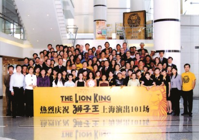 音乐剧《狮子王》在上海完成101场演出后,全体人员进行了大合影。