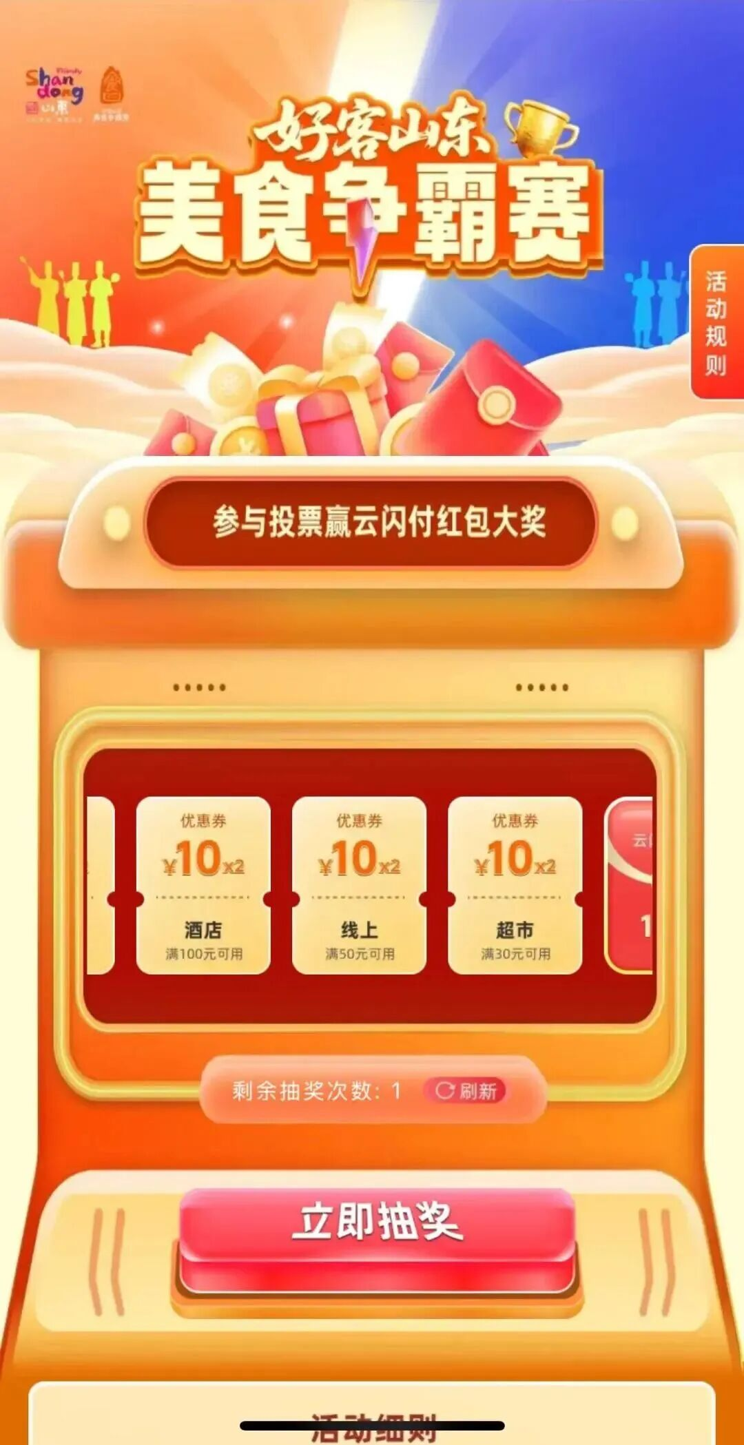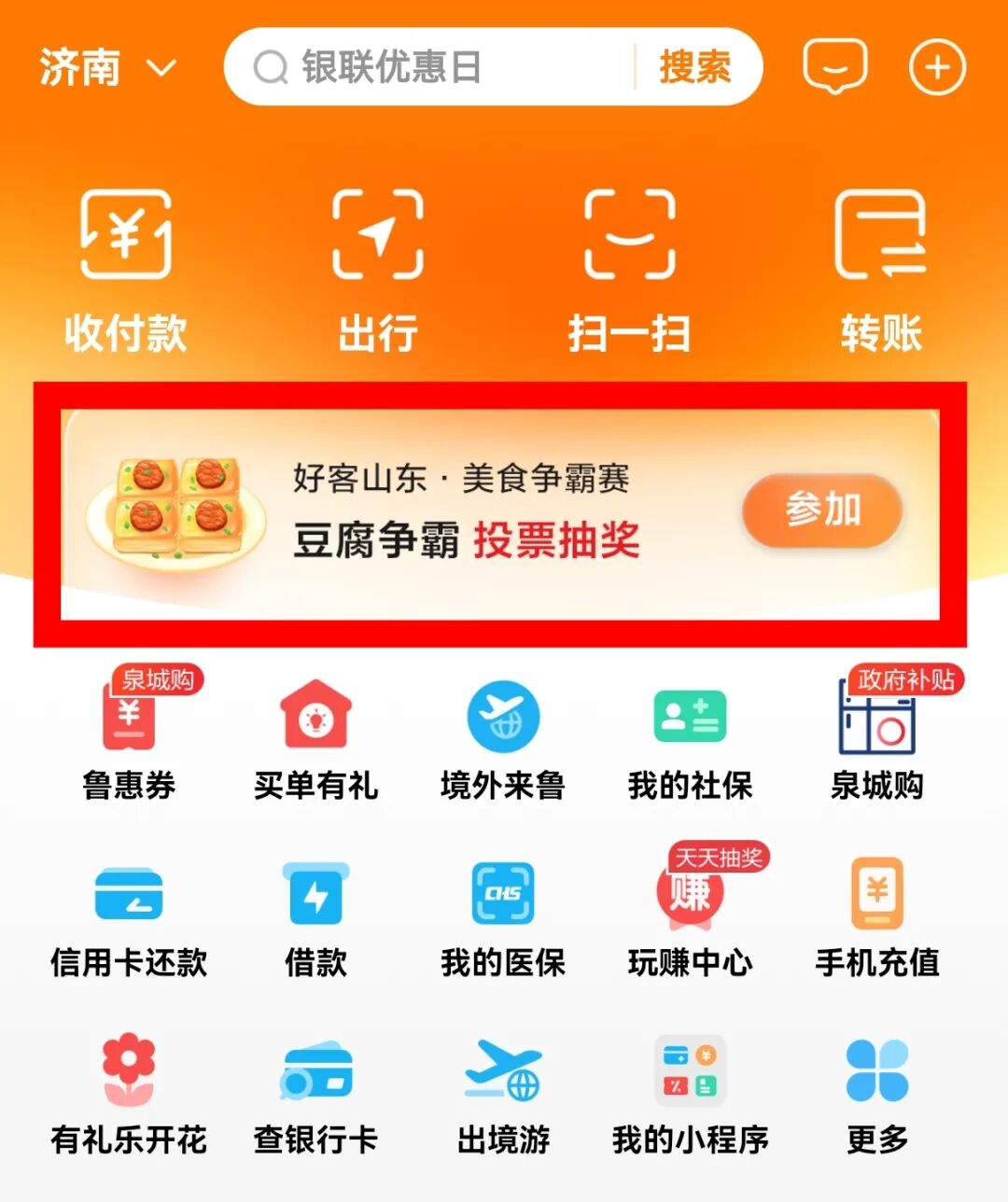方式二:打开云闪付APP,首页点击“好客山东美食争霸赛”跳转到“美食争霸赛”专属专区,为济南加油助力。