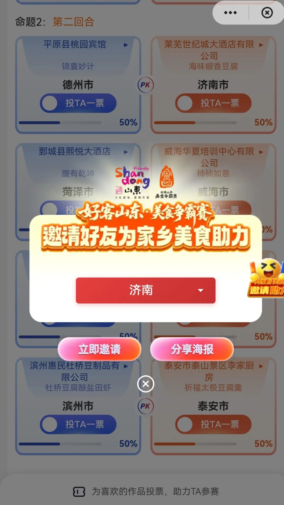 利用美食争霸赛投票界面“邀请助力”功能,点击并选择“济南市”,生成城市专属链接,邀请好友一同参与投票!助力家乡美食出圈!