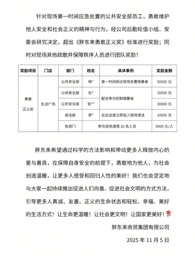 11月5日,胖东来官方发布了《关于胖东来员工勇敢正义奖励公示》。