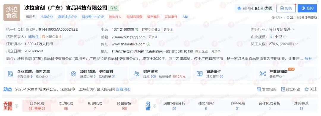 天眼查显示,其运营主体“沙拉食刻(广东)食品科技有限公司”正在被申请破产,资金链危机进入司法处置阶段。公司创始人因债务纠纷被法院悬赏执行,若隐匿财产、逃避执行,法院将发动社会力量查找线索推动债务清偿。