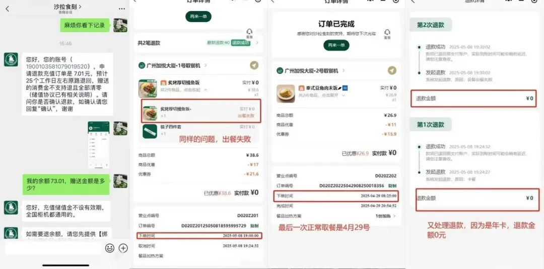 “一夜之间,售餐机没了”,顾客储值卡难退。多位用户反映账户有余额但柜机撤了无法退款,还有消费者买的年卡无法履约。餐柜常“售罄”,客服响应慢,消费体验差。全国多个城市的点位基本“全线停机”,品牌运营停滞。