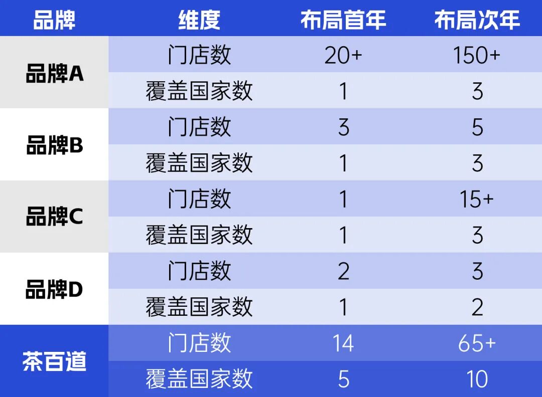 茶百道是个特别的例子。它2024年才出海,首站选在韩国,而非热门的东南亚。和行业头部品牌出海头两年的速度相比,茶百道起跑很快。
