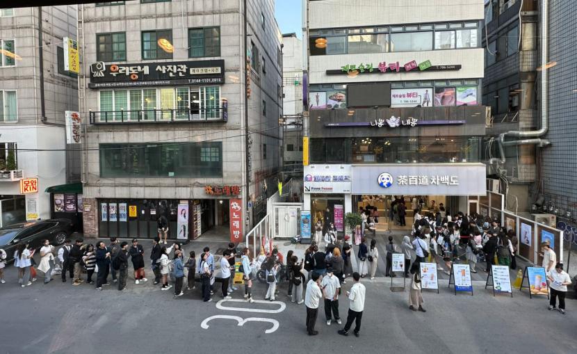 茶百道韩国门店顾客排队购买