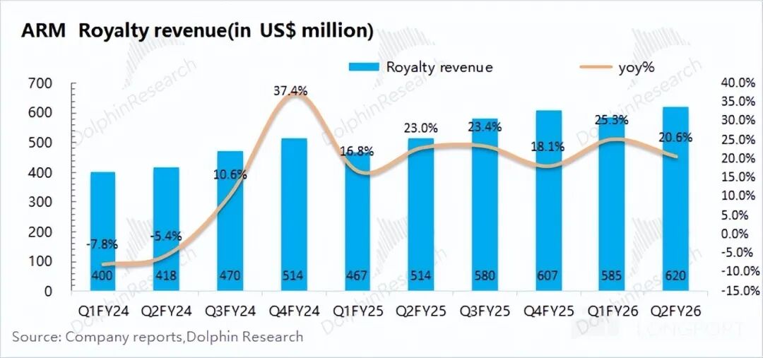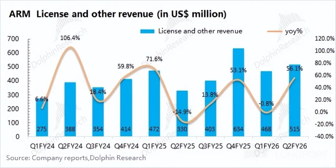 b)版税业务:本季度版税业务收入6.2亿美元,同比增长20.6%,主要受数据中心及智能手机等相关需求推动。Neoverse(数据中心产品线)专利使用费提高和CSS产品陆续上市,是版税业务增长的主要动力。