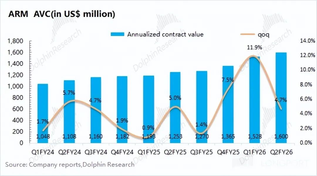 2)年化合同价值(ACV):是下季度收入的前瞻指标。本季度年化合同价值16亿美元,环比微增4.7%。结合本季度收入情况,海豚君预计本季度老合同折算入收入的金额约为3.8亿美元,“新增合同计入本季收入 + 本季版税收入” 合计约为7.5亿美元。
