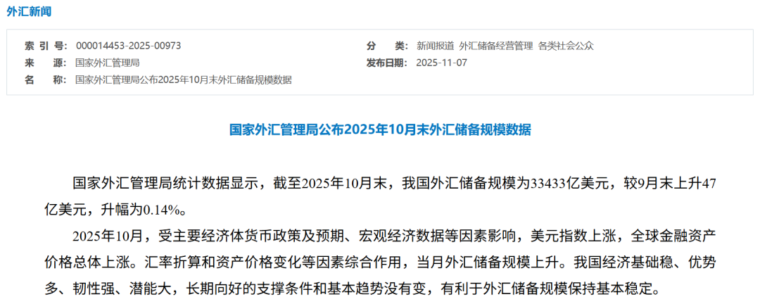 国家外汇管理局(下称外汇局)11月7日公布的最新统计数据显示,截至2025年10月末,中国外汇储备规模达33433亿美元,较9月末增加47亿美元,升幅0.14%,处于2015年12月以来的最高水平。目前,我国外汇储备已连续3个月稳定在3.3万亿美元以上。