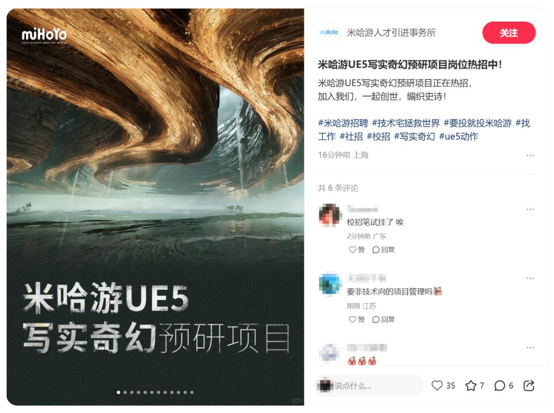 据悉,此次是米哈游旗下UE5写实奇幻项目进行对外招聘。自去年9月米哈游曝光5款神秘新游之后,这是该产品在今年首次露面。