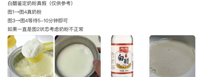 消费者对奶粉真假鉴别高度关注,网上很快出现水溶解法、感官法、碘酒法、白醋法等多种鉴别方法,其中“白醋鉴定法”传播最广。