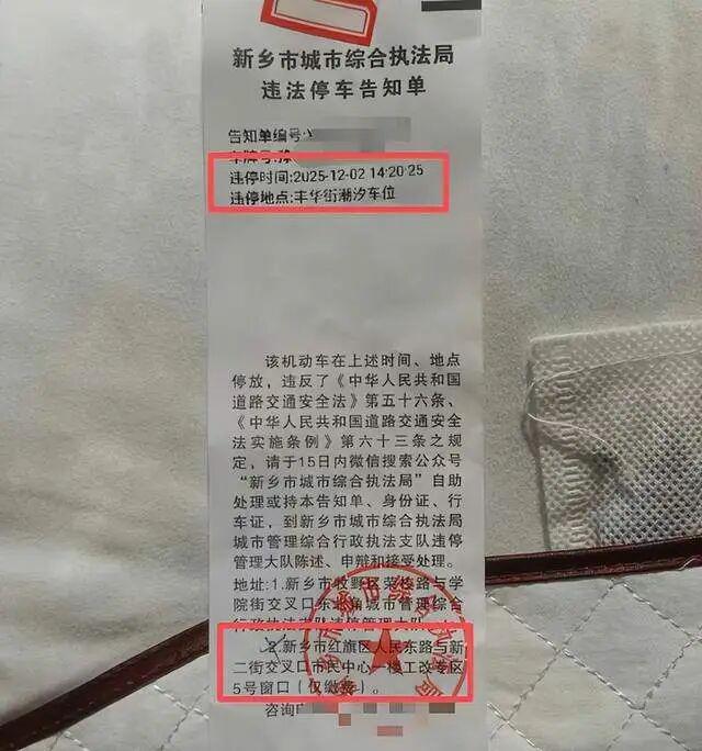 12月2日下午约2点30分,时先生因心脏不适,将车停在新乡市高新区丰华街与午阳路交叉口北侧的停车位内,之后便在副驾驶位睡着了。下午3点07分左右,他醒来下车时,发现驾驶室车窗上已被贴上《违法停车告知单》,落款单位为新乡市城市综合执法局。