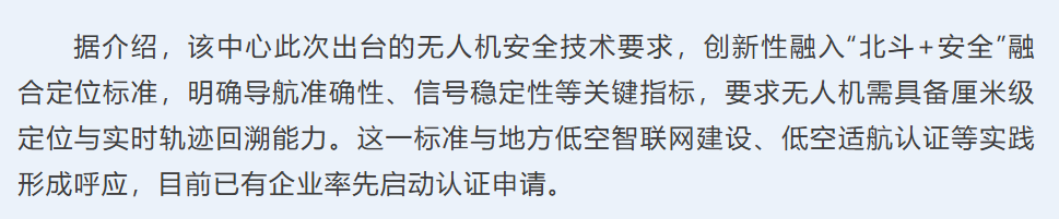 今年以来,中国网络安全审查认证和市场监管大数据中心已新增颁发10余张北斗卫星导航产品认证证书。此外,该中心近期制定了低空经济领域无人机产品安全技术要求,并同步启动了认证工作。