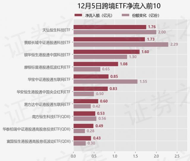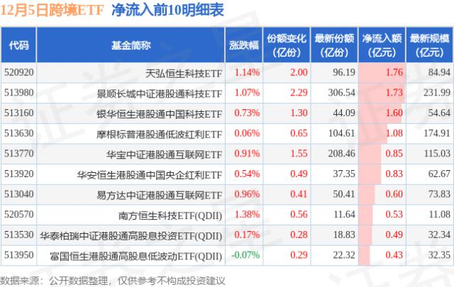 在当日的跨境ETF基金中,有40只产品出现资金净流入情况。其中,天弘恒生科技ETF(520920)占据净流入首位,其份额增加了2.0亿份,对应的净流入金额为1.76亿元。
