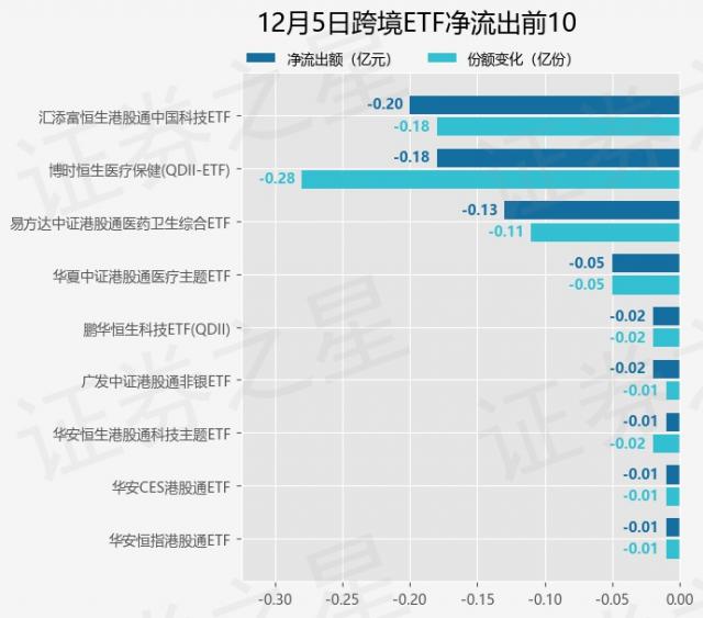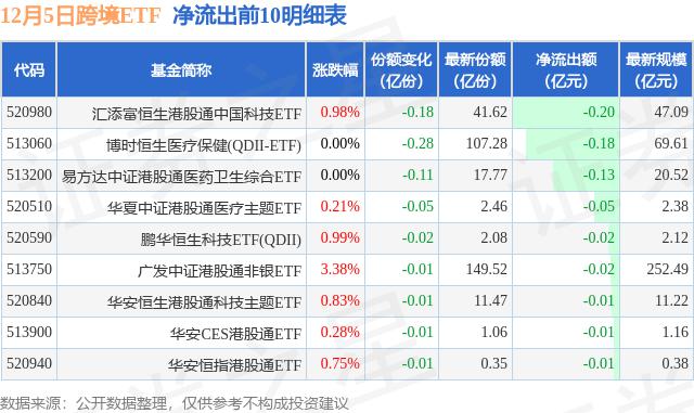 当日也有9只跨境ETF基金出现资金净流出,汇添富恒生港股通中国科技ETF(520980)是净流出最多的产品,其份额减少了1800.0万份,净流出金额为2016.65万元。